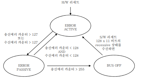 Bus Off에서 벗어나려면, HW reset이나 SW reset 혹은 부가적인 Wait Time 이후에 천이될 수 있다.