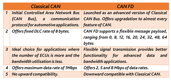 Classic CAN은 11 bit(표준) 및 29 bit(extended)를 제공하는 반면에, CAN FD는 이름에서 알 수 있듯이 Frame 당 0 ~ 64 bytes 범위 내에 유연한 데이터 전송률을 제공한다.