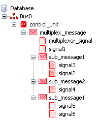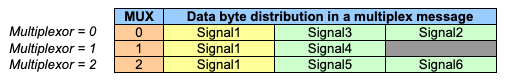 Multiplex message는 일반적으로 메시지의 DLC가 허용하는 것보다 더 많은 Signal을 전달할 수 있게 한다. Multiplex message를 정의하려면 포함된 signal이 "multiflexor"로 설정된 경우 해당 값(index)은 message의 나머지 바이트에서 어떤 데이터가 전송되는지를 나타낸다.