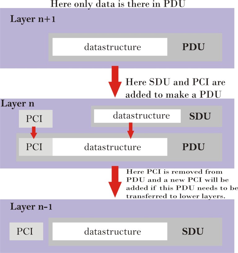 간단히 말하면, PDU는 상위 계층에서 하위 계층 혹은 그 반대로 전송되며, 이 내부에는 SDU와 PCI가 포함되어 있다.