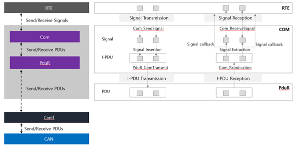 COM 모듈을 기점으로 상위 Layer는 Signal을 사용하고, 하위 Layer는 PDU를 사용하다. Signal은 실제 주고 받을 데이터, PDU는 Layer 간에 전달하는 추상화된 정보로 가정할 수 있다. application에서 전달된 Signal은 COM의 I-PDU buffer에 저장되고, PduR_ComTransmit 함수에 의해서 I-PDU 형태로 PduR에 전달된다. 반대로 PDU를 수신 받을 때는 PduR에서 Com_RxIndication 함수를 통해서 수신된 PDU가 있음을 전달 받고, COM에서는 I-PDU 내에 signal을 분석해서 해당 Signal의 Callback함수를 호출하여 RTE를 통해 Signal이 application으로 전달된다.