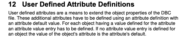 DBC File Format Documentation이라는 문서를 찾아봐도 Attribute에 대한 명확한 설명은 나와있지 않다.