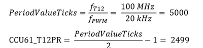 만약 fT12 = fCC6 = 100 MHz (CCU61_TCTR0.T12CLK = 0x0), 프리스케일러가 비활성화되어 있고 (CCU61_TCTR0.T12PRE = 0x0), 중앙 정렬 모드가 선택된 경우 (CTM = 0x1), 주기 값(CCU61_T12PR)은 다음과 같이 계산될 수 있습니다:
