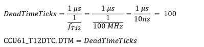 각 채널에 대한 데드타임 생성이 활성화되면, 파워 스테이지에서의 단락을 방지할 수 있습니다. 데드타임 값은 틱으로 계산할 수 있습니다.: