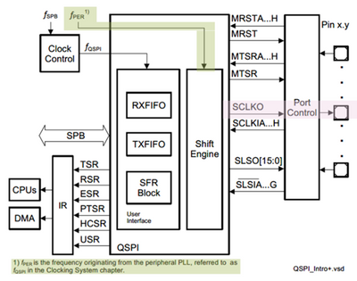QSPI 개요 다이어그램(그림 2)에서 fPER은 그림 1에서 도출한 fQSPI이며, 이는 QSPI 모듈 시프트 엔진의 주파수입니다. 따라서 시프트 엔진은 fSPB와 독립적인 별도의 주파수 영역(즉, fPER)에 배치됩니다.