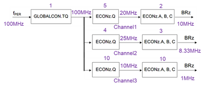 SPI bus baud 속도는 GLOBALCON 및 ECON 레지스터를 구성하여 그림 3과 같이 fPER에 의해 결정됩니다. fPER는 먼저 글로벌 디바이더를 통과한 다음 채널별 디바이더를 통과하여 SPI 채널에 원하는 baud 속도에 도달합니다.