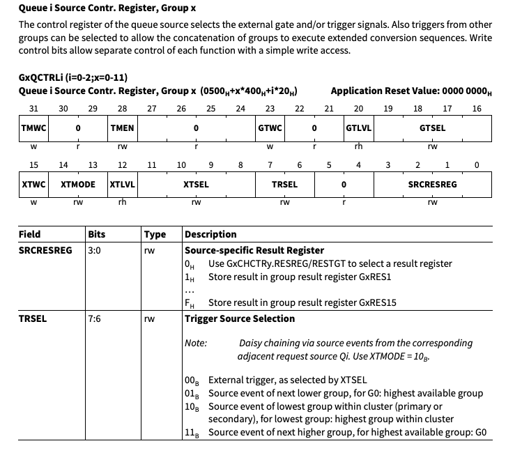 또한 GxQCTRLi register의 SRCRESREG를 이용하여 ADC 결과를 어떤 Group Result Register에 담아서 확인할 것인지 정할 수 있다.