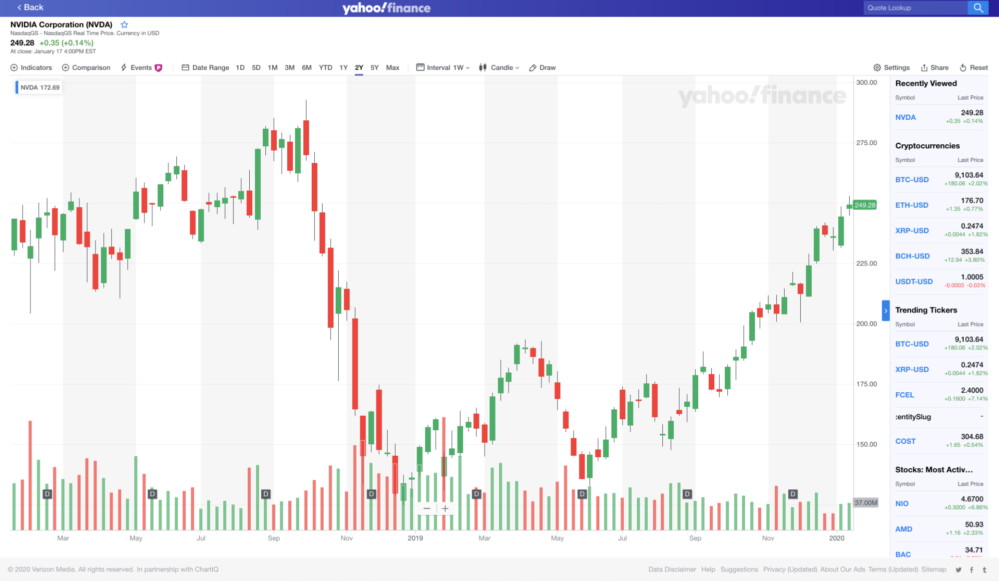 그렇게 한 차례 홍역을 겪었지만, 2012년부터 등장한 AI 산업은 NVIDIA의 또 다른 먹거리로 급부상하고 있었고, 현재 이 시장이 급속하게 확장되고 있다. 현재 NVIDIA 주가는 2020년 1월 17일자 기준으로 249.28 달러를 기록하고 있고 상승세를 기록하고 있다.