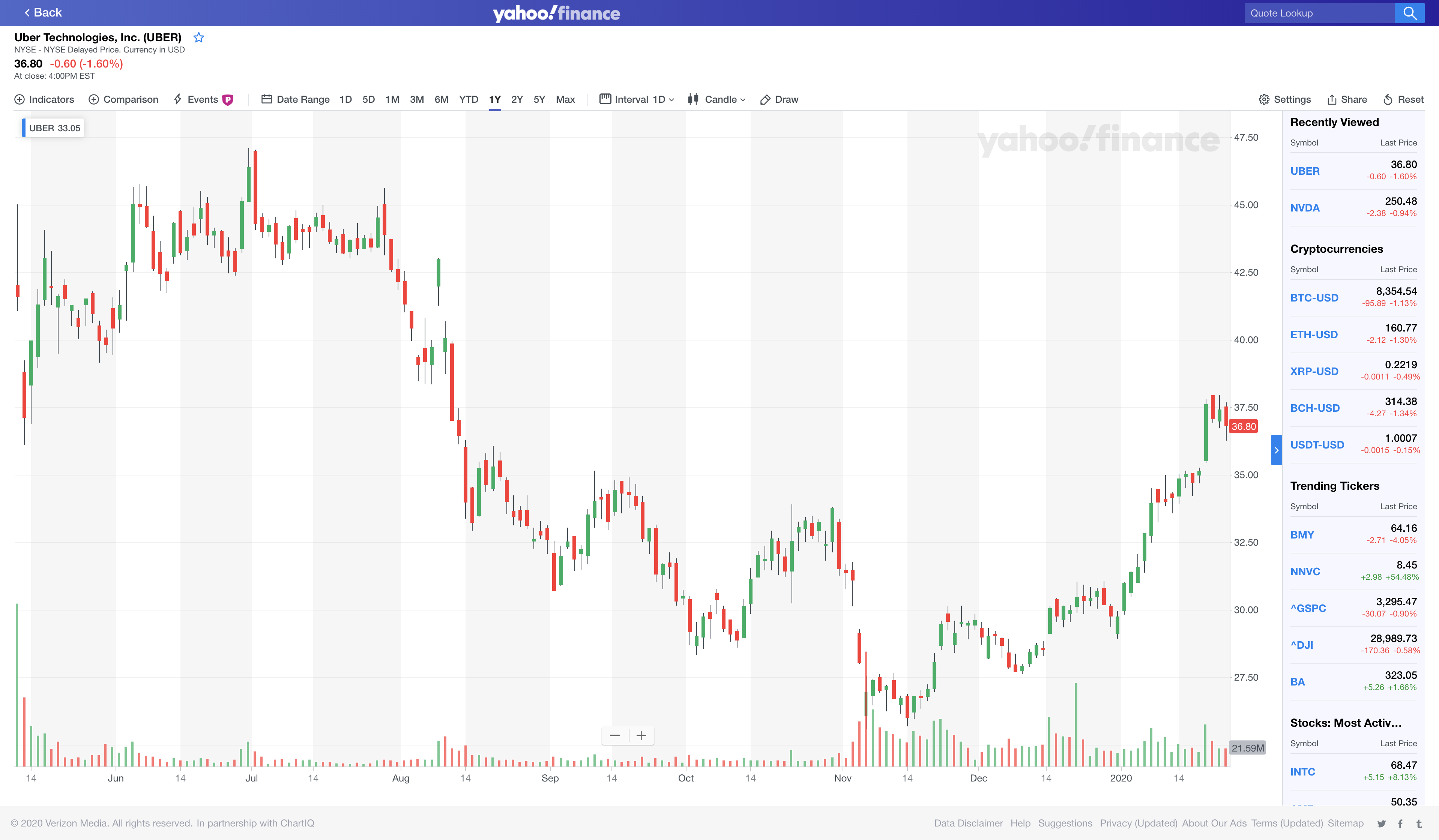 2020년 1월 24일 자 Uber의 현재가는 36.80달러이다. Uber는 작년 5월 상장 당시, 공모가 45달러에서 당일 7.62%가 빠지면서 안 좋은 출발을 보여주었다. Uber는 실적 발표 때마다 큰 폭의 하락을 보여줬는데 2019년 1분기에는 10억 달러, 2분기 52억 4천만 달러의 순손실을 내며 주가 하락을 이끌었다.