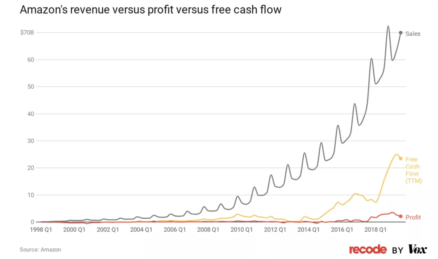 위의 그림을 보다시피 아마존은 매년 매출이 급격하게 늘지만, 실제로 Profit의 증가율은 상당히 미미하다고 볼 수 있다. 이 말은 첫째로 시장점유율을 선점하는 것이 당장의 이익보다 낫다고 생각해서 극단적인 정책을 펼친다고도 볼 수 있다.