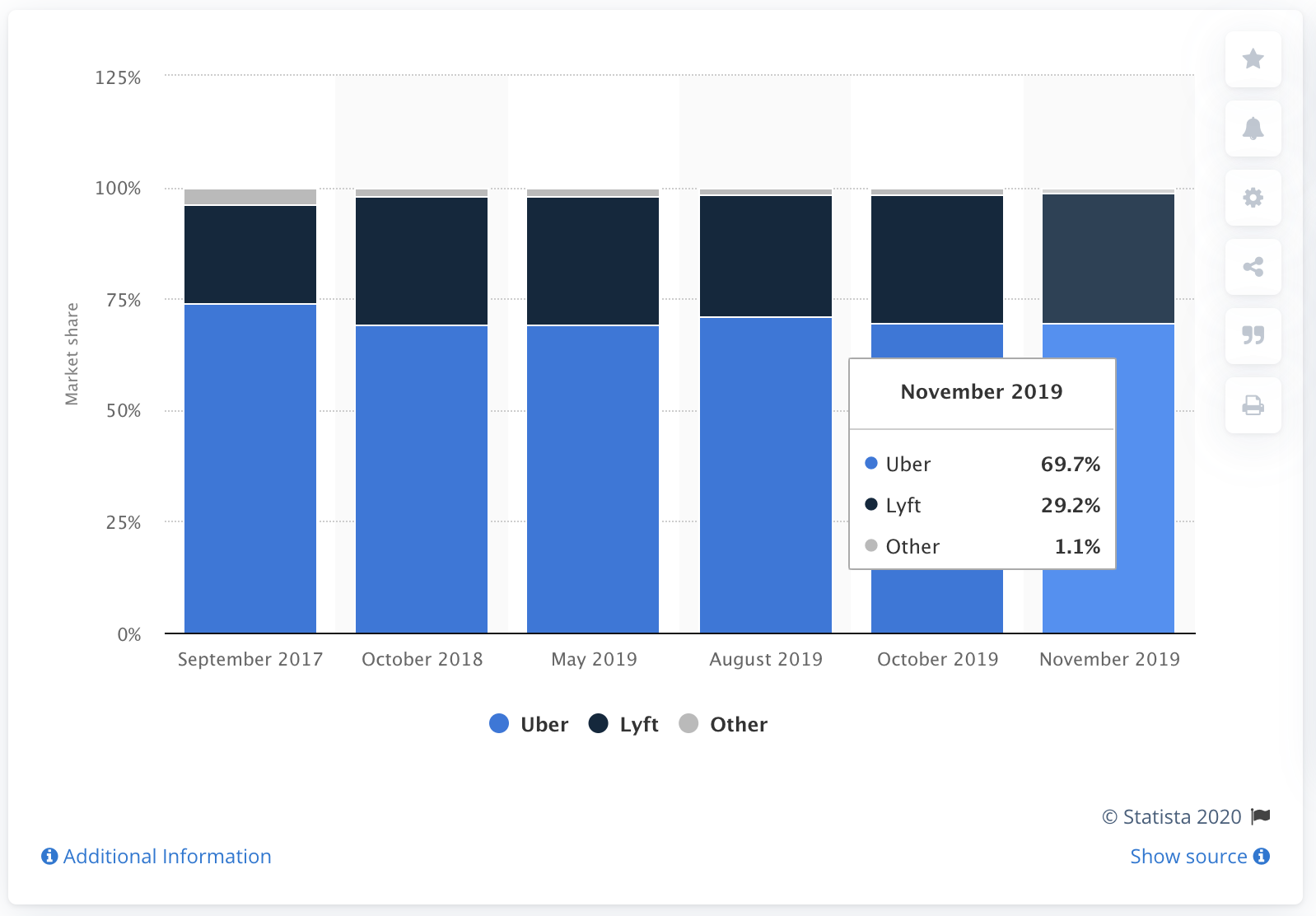 현재 미국의 공유차 시장 점유율은 2019년 11월 기준 Uber가 69.7%. Lyft가 29.2%를 점유하고 있다.