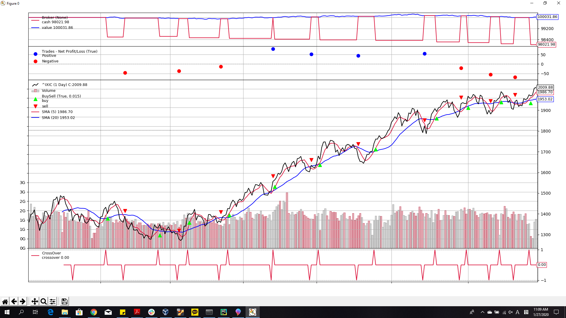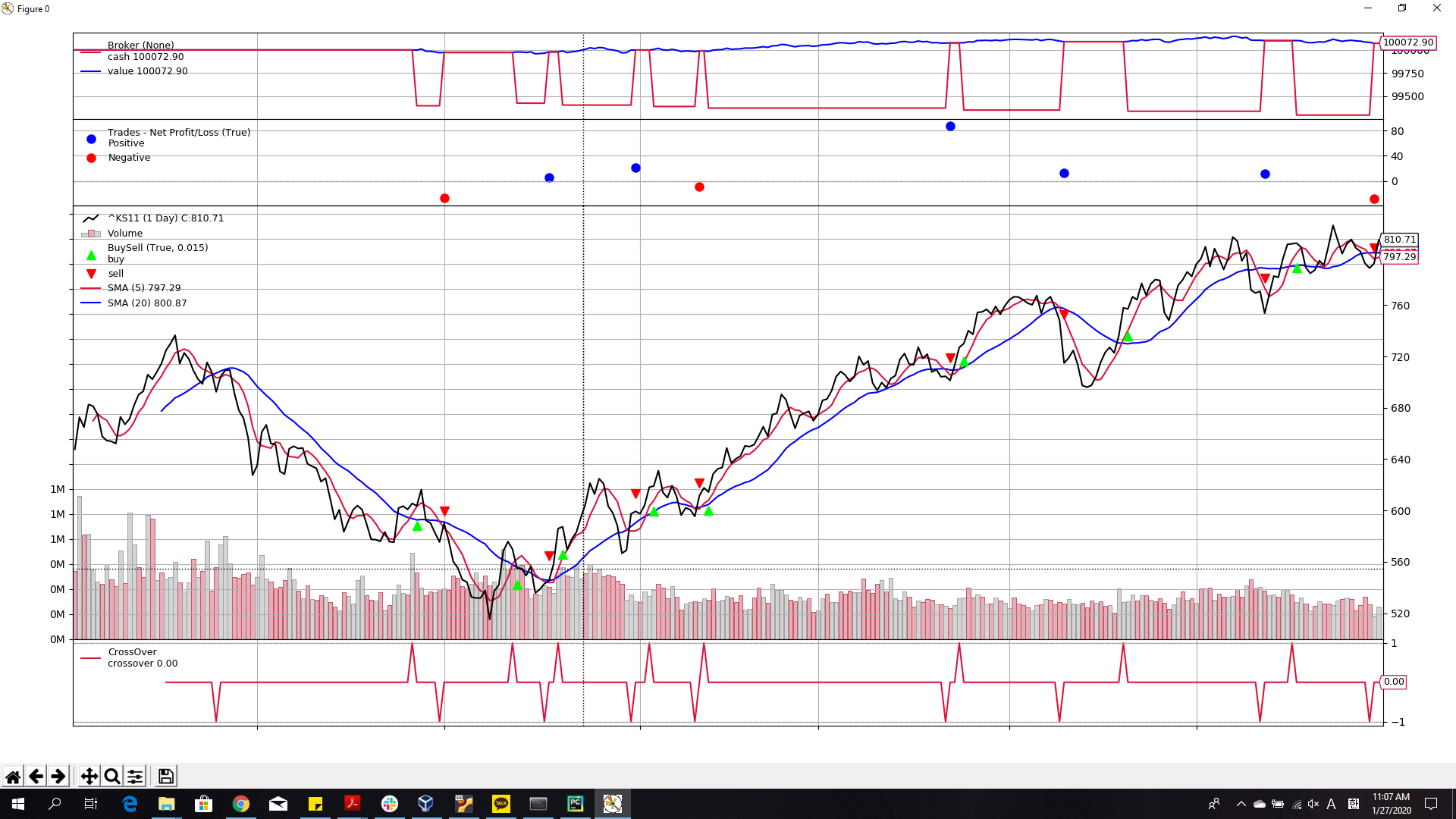 물론 SARS 사례만으로 우한 코로나 사태를 예측할 수는 없지만, 두 주가 추이의 공통점은 발병 초기에 시장이 겁을 먹고 고 단기간에 하락을 한 뒤, 점차 회복한다는 점이다. BackTrader를 통해서 이런 Historical Data를 불러온 뒤, 여러가지 매매 알고리즘을 테스트해 볼 수 있다. 위의 두 사진의 경우 앞 선 포스팅에서 설명한 이평선 크로스 매매를 적용한 결과이다.