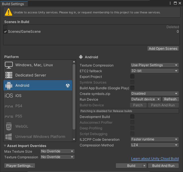 File - Build Settings에 들어가서 Platform을 Android르 변경한다.