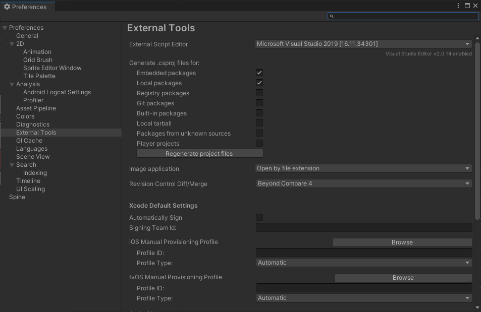 유니티와 VS를 연동하기 위해서는 Edit - Preferences로 들어가서 External Tools에 External Script Editor를 사용하고자 하는 Visual Studio 버전에 맞게 구성하면 된다.
