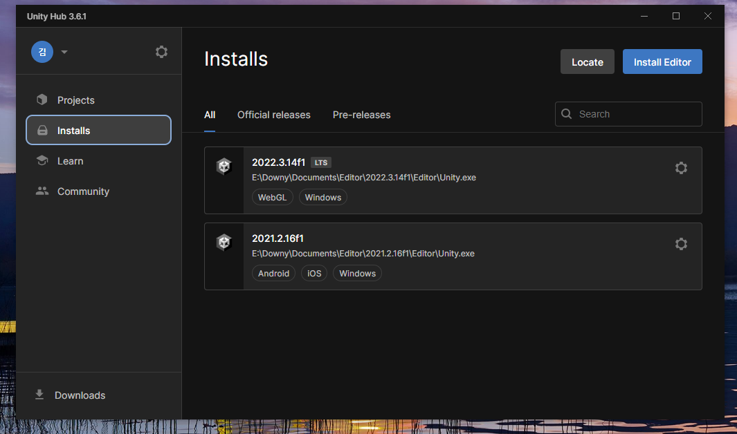 나는 여기에 2개의 유니티 버전을 설치했는데, 위의 것은 가장 최신의 안정된 버전으로 LTS 표기가 되어 있다.