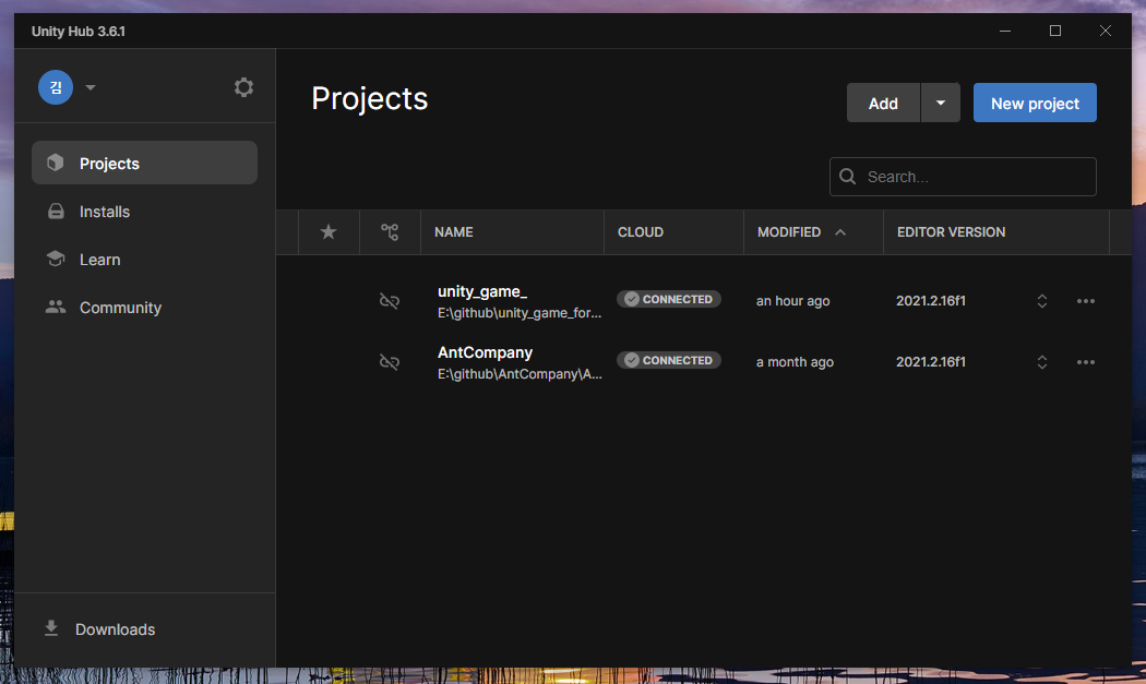 나의 경우에는 기존 프로젝트가 있었기 때문에 유니티 허브에서 해당 프로젝트를 불러와서 사용하고 있다.
