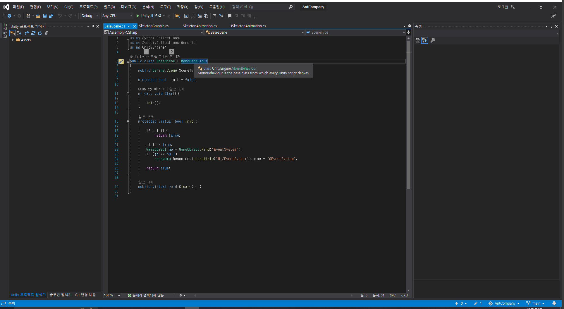 이럴 경우, 코드를 수정하고자 할 때 유니티 사전 정의함수를 사용하지 못하므로 자동완성 기능 등이 없이 코드를 작성해야 하는 수고스러움이 있다.