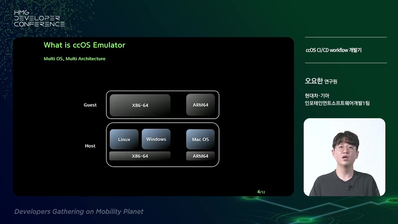 현대자동차에서는 ccOS 소프트웨어 개발을 위한 레퍼런스 플랫폼의 개발 환경과 실행 환경, CI/CD를 구축한 개발기를 소개하고 있어요.