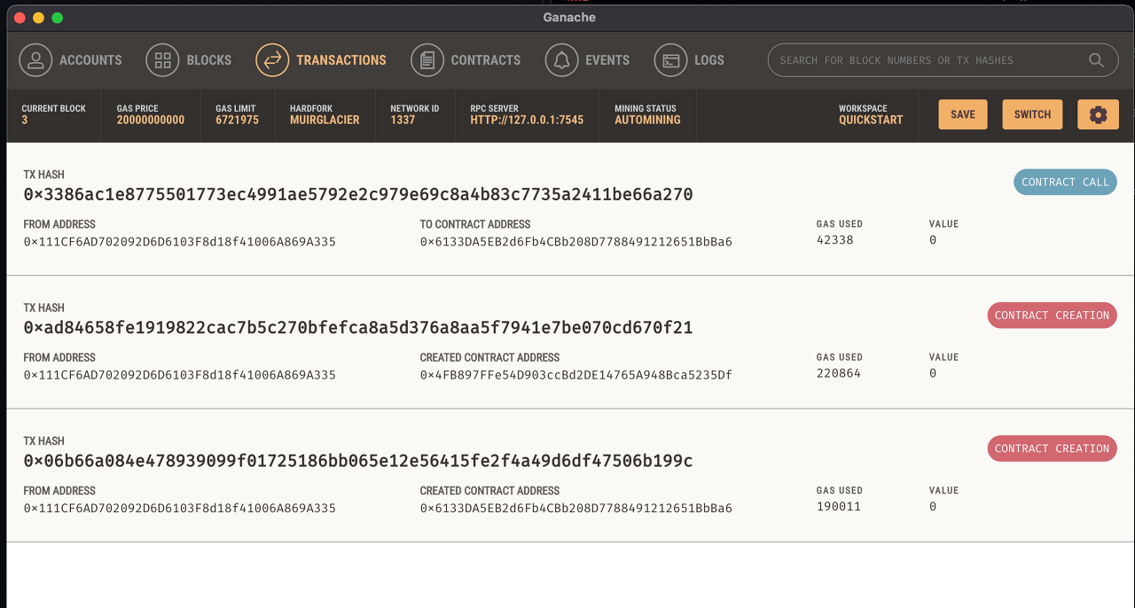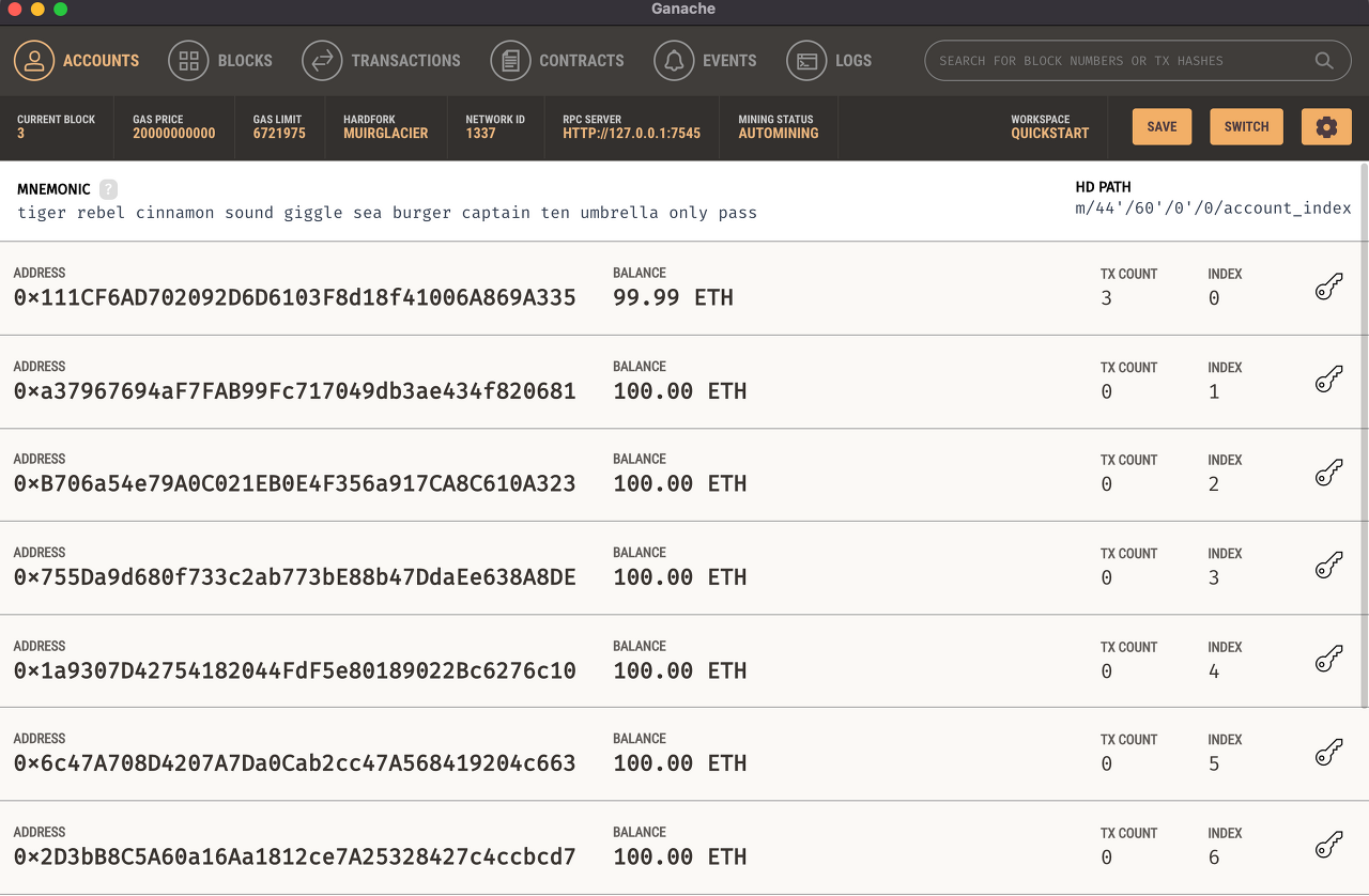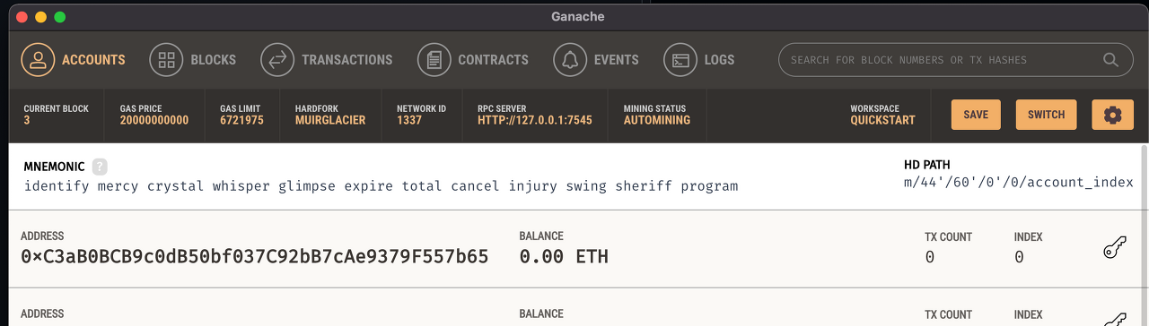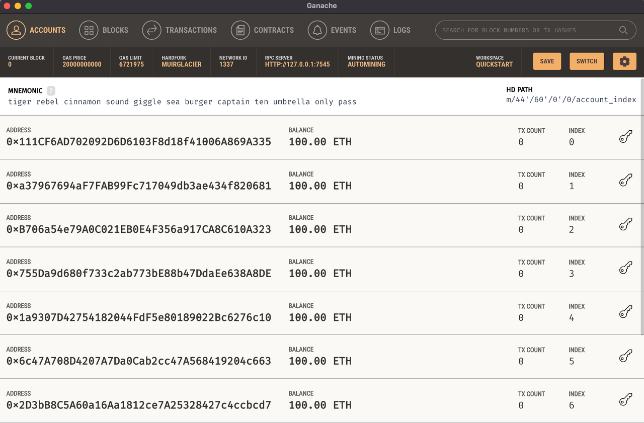 배포 전의 Ganache를 살펴보면 아래와 같습니다.