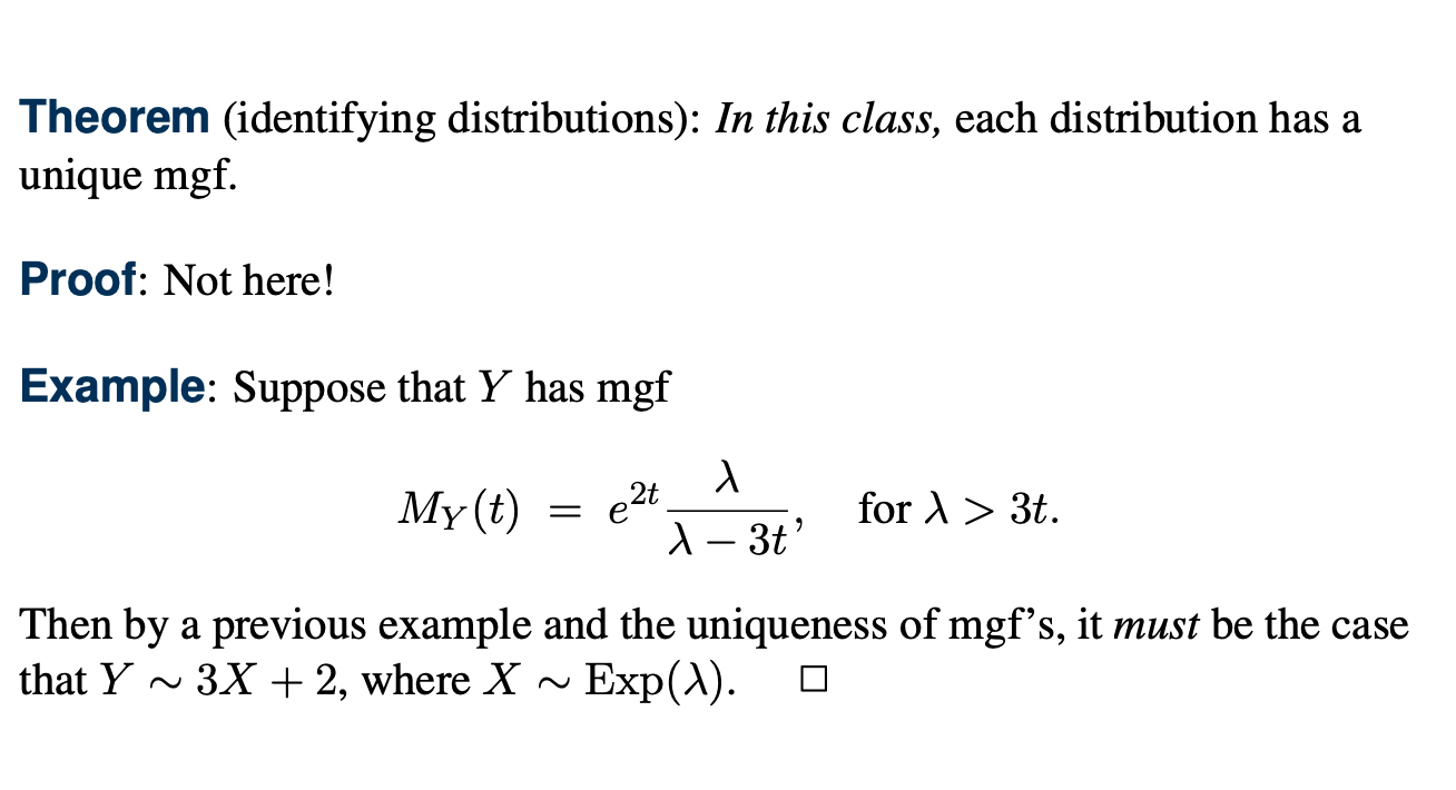 만약에 같은 mgf를 가지는 서로 다른 두 개의 확률변수가 있다면, 이들은 서로 같은 분포를 가지게 된다.