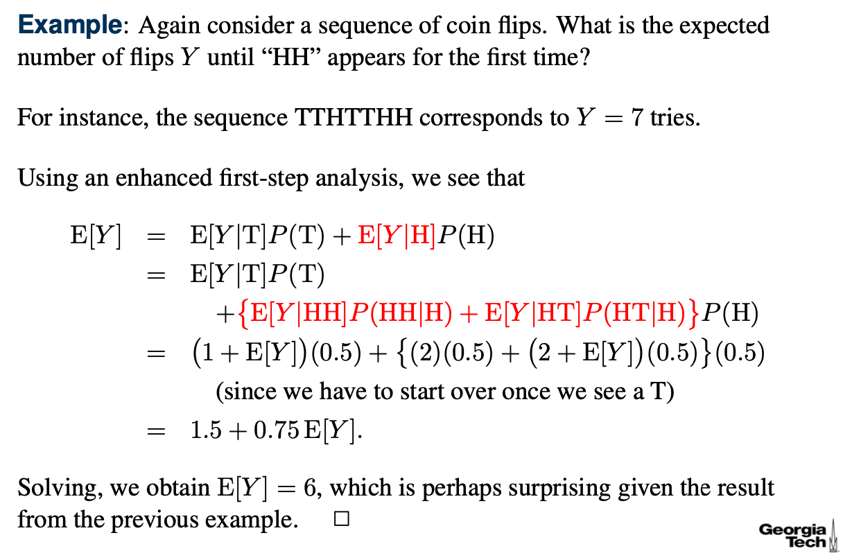 X를 첫 토스해서 Head나 Tail이 나올 사건이라고 가정하면, X = T인 경우에는 첫 시도는 실패이므로, 1을 더해야하므로 E[Y|X] = 1 + E[Y], X = H인 경우에는 1회만에 성공이므로, E[Y|X]는 1이다.