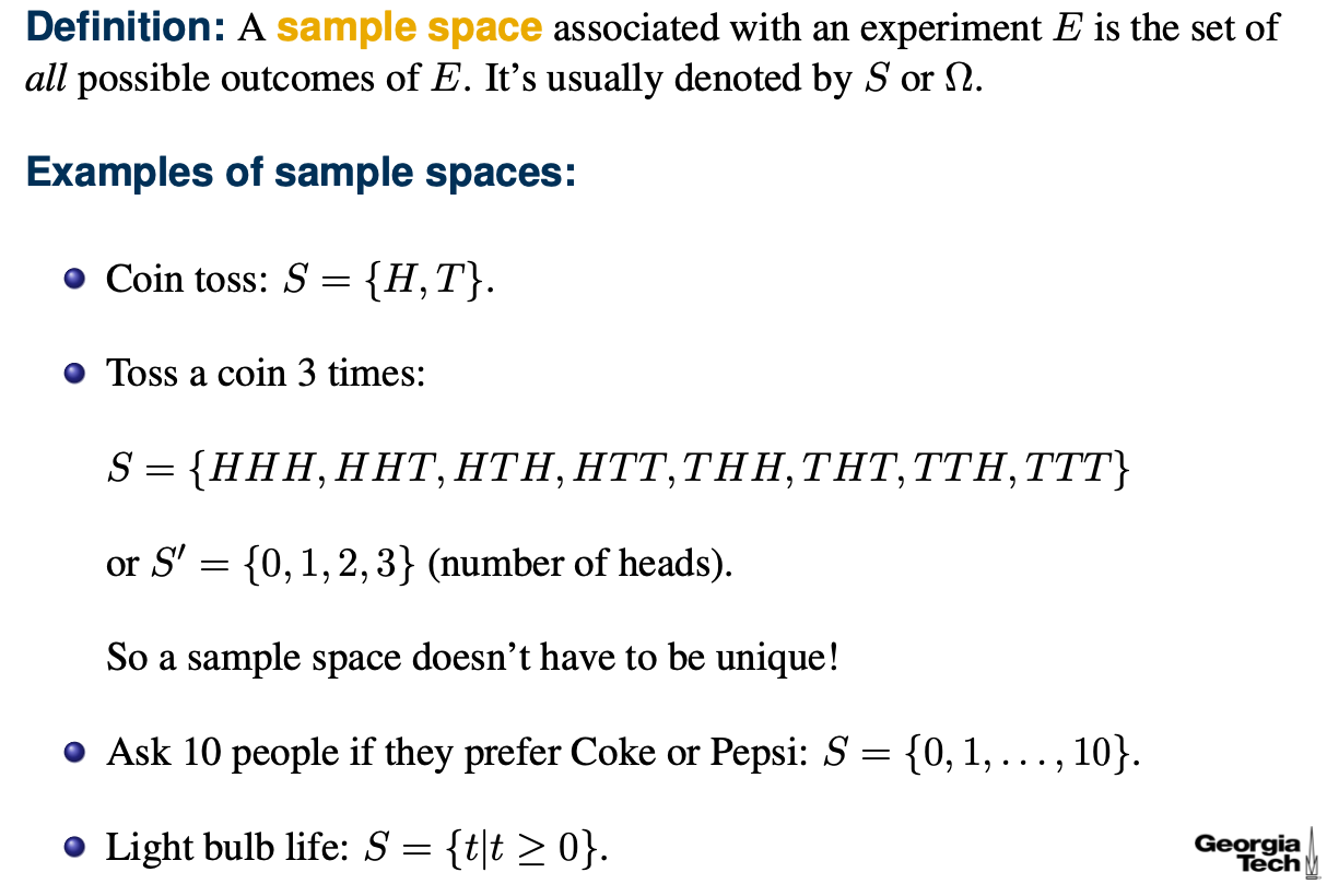 가령 동전 던지기에 대한 Sample space는 S = {H, T}로 정의할 수 있는데 여기서 H는 Head, T는 Tail이라고 볼 수 있다.