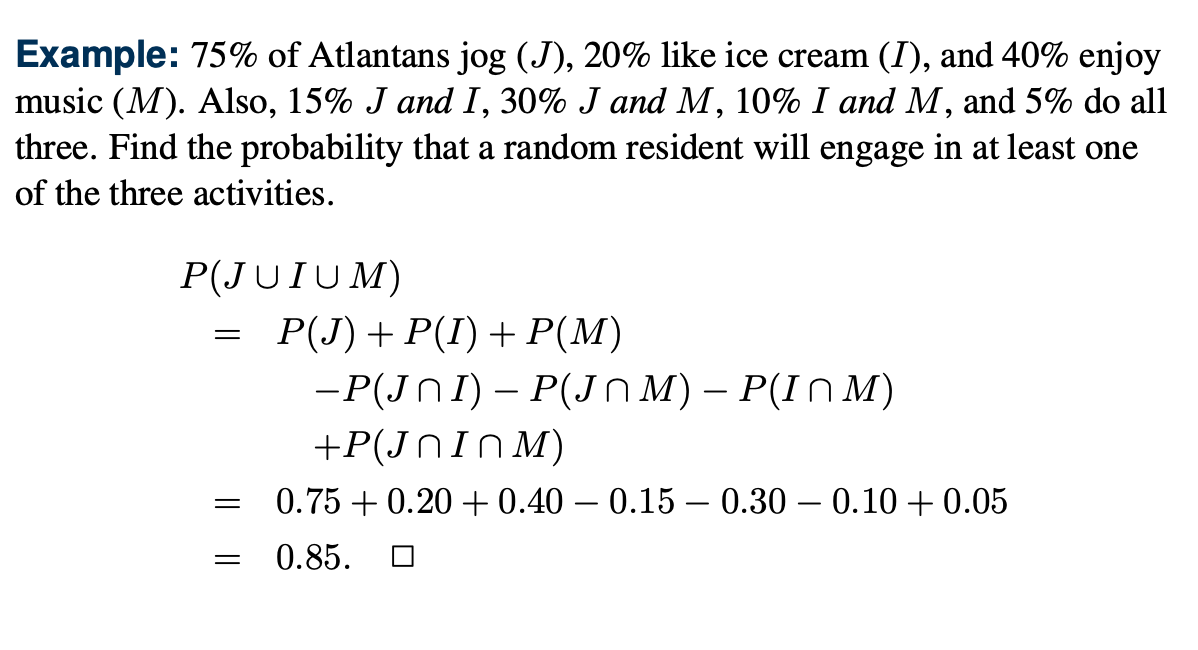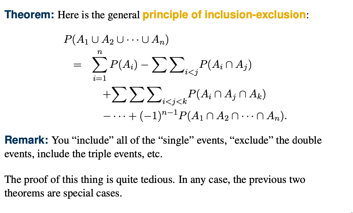 n개 사건의 합집합에 대해서 짝수개의 사건의 교집합은 빼고, 홀수개의 사건의 교집합은 더하는 식으로 전개할 수 있다.