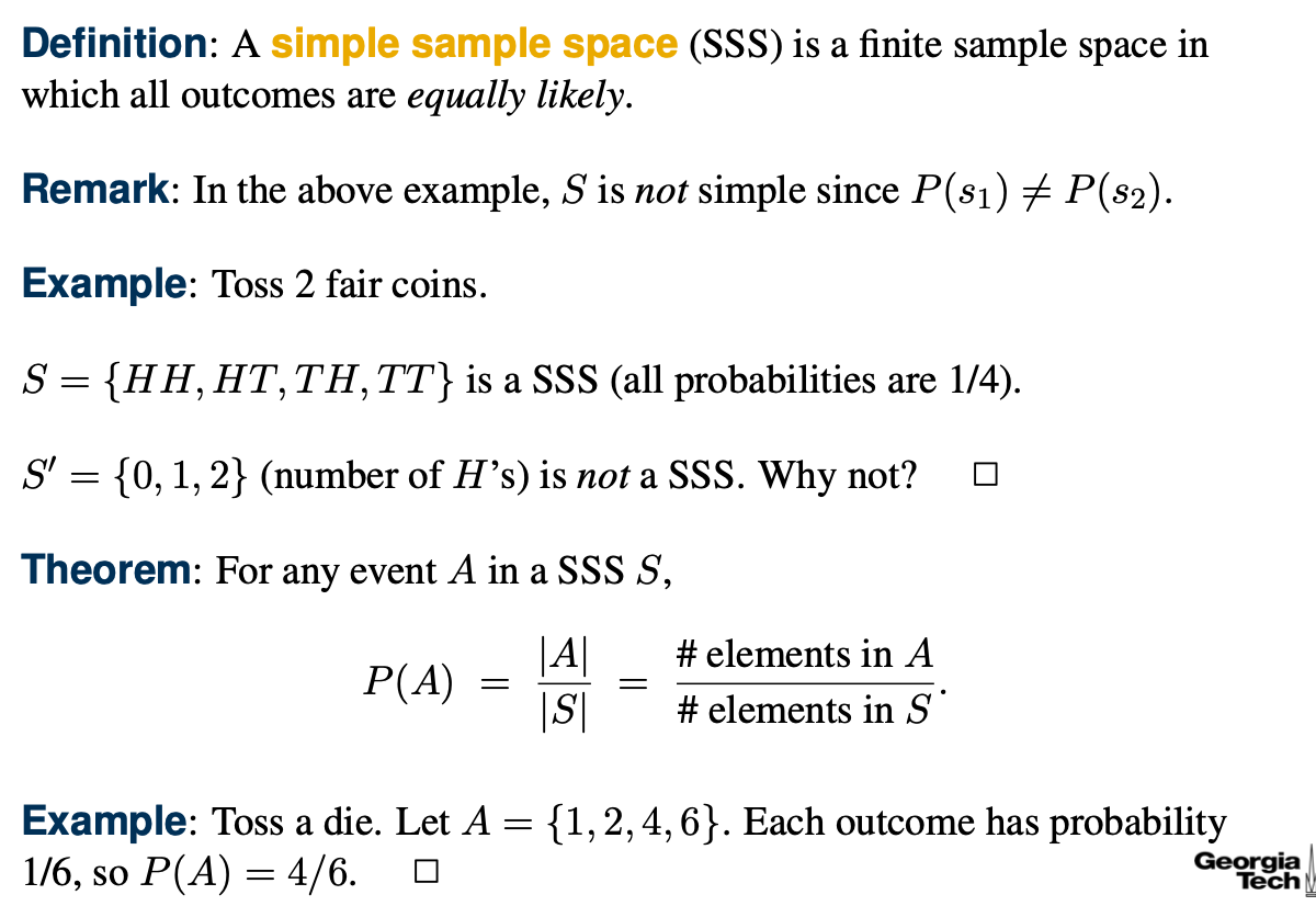 Sample space의 사건들의 확률이 전부 동일할 때 Simple sample space라고 한다.