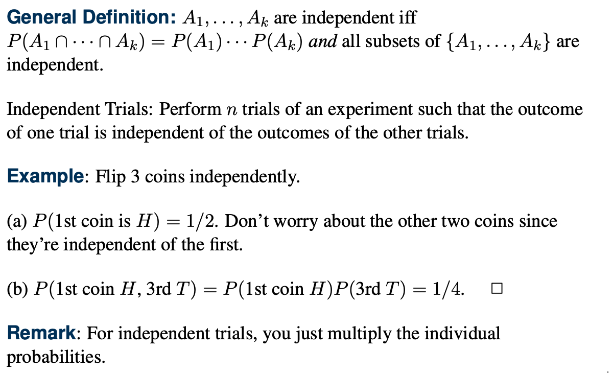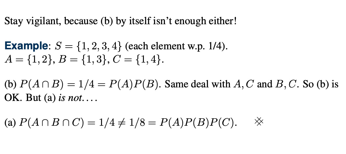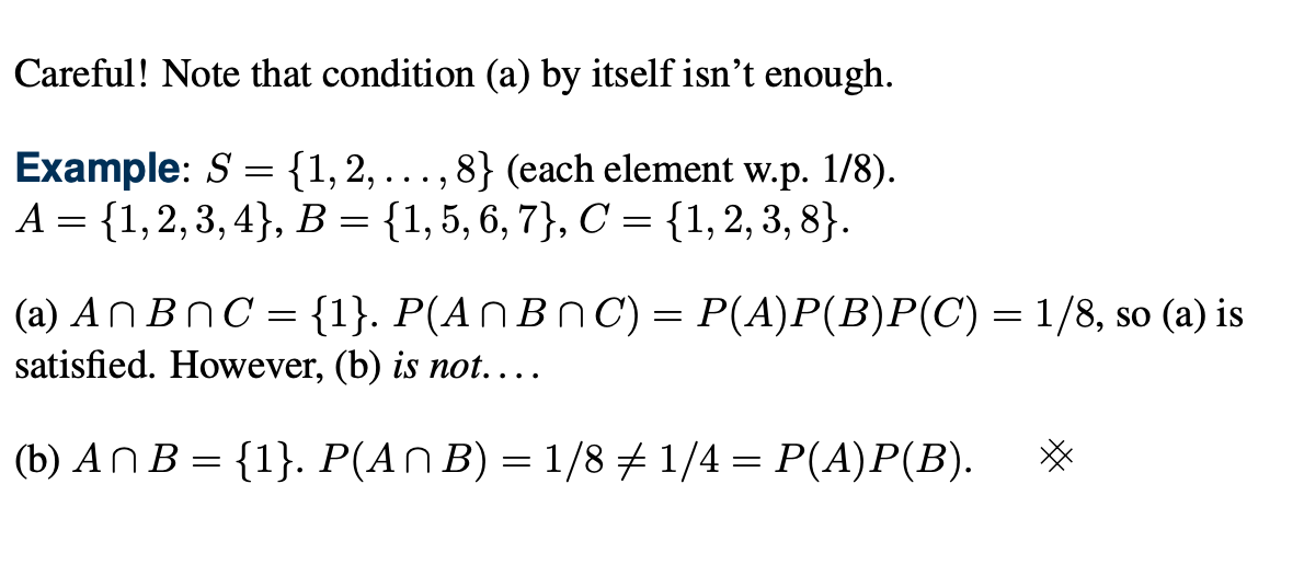 결국 k개의 사건이 서로 독립이기 위해서는 전체의 교집합의 확률이 각각 사건의 확률의 곱으로 이루어지는 것도 필요하지만 각각 subset내에서의 교집합의 확률과 각 사건의 확률곱이 일치해야만 한다.