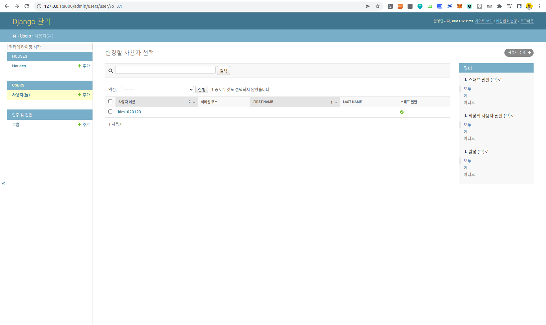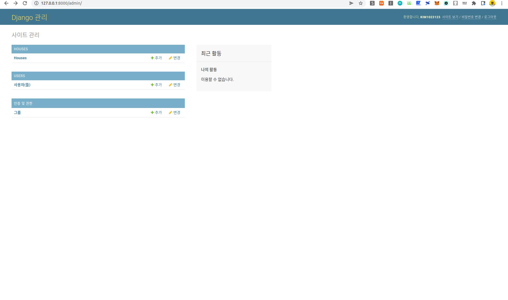 자 이제 admin 페이지 내에 사용자 admin 페이지를 들어가면 아래와 같이 화면이 나오는 것을 볼 수 있다.