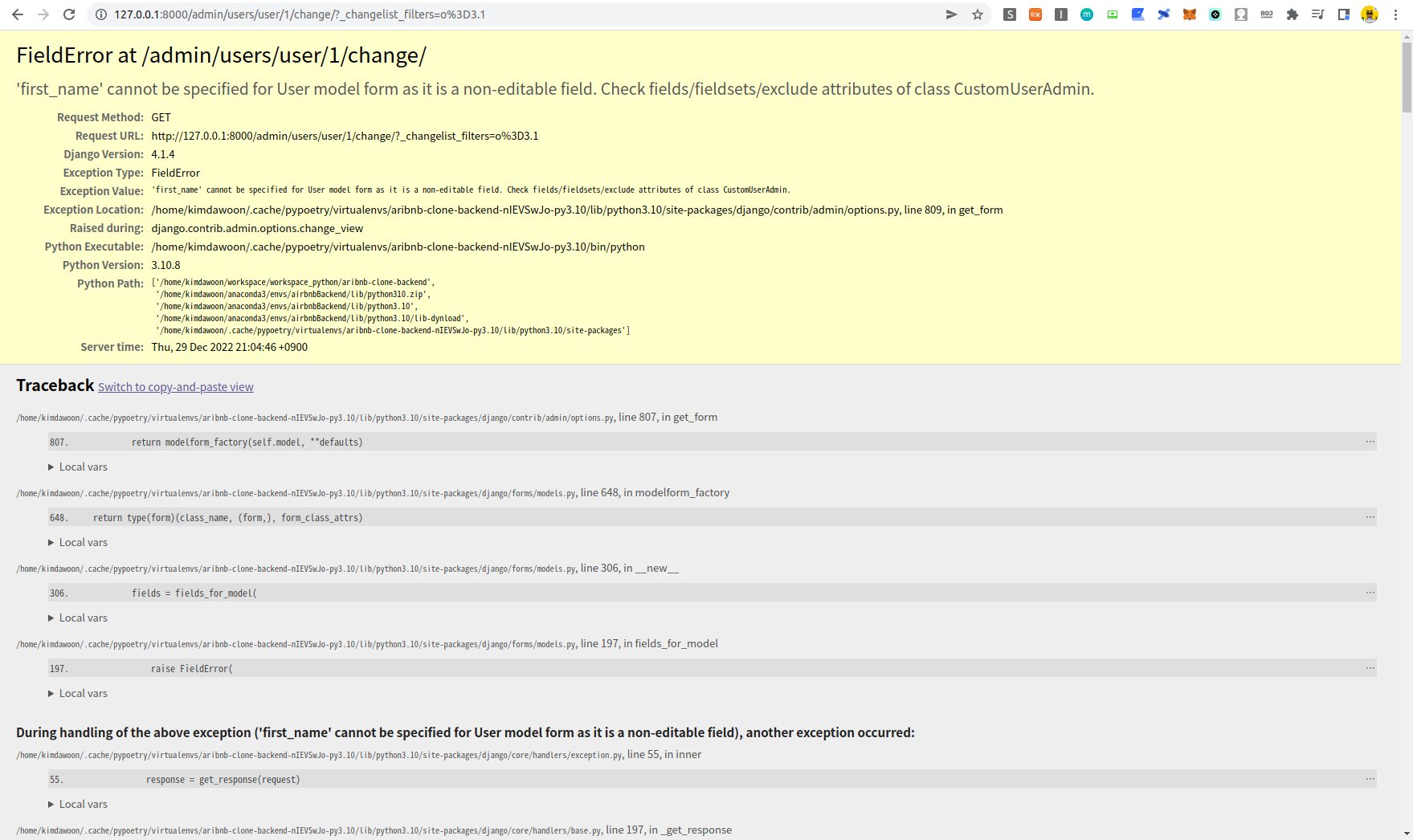 이유는 first_name과 last_name을 수정할 수 없게 설정하였는데 user의 admin 화면은 기존에 Django에서 제공하는 admin 화면을 상속받아서 사용하고 있기 때문에 이런 부분이 충돌이 나서 발생하는 것이다.