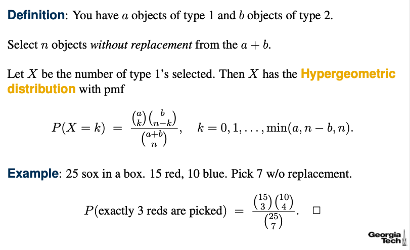 Hypergeometric Distribution은 여러 종류의 물체가 섞여 있을 때에 각각 고르는 경우에 대한 확률 분포를 의미한다.