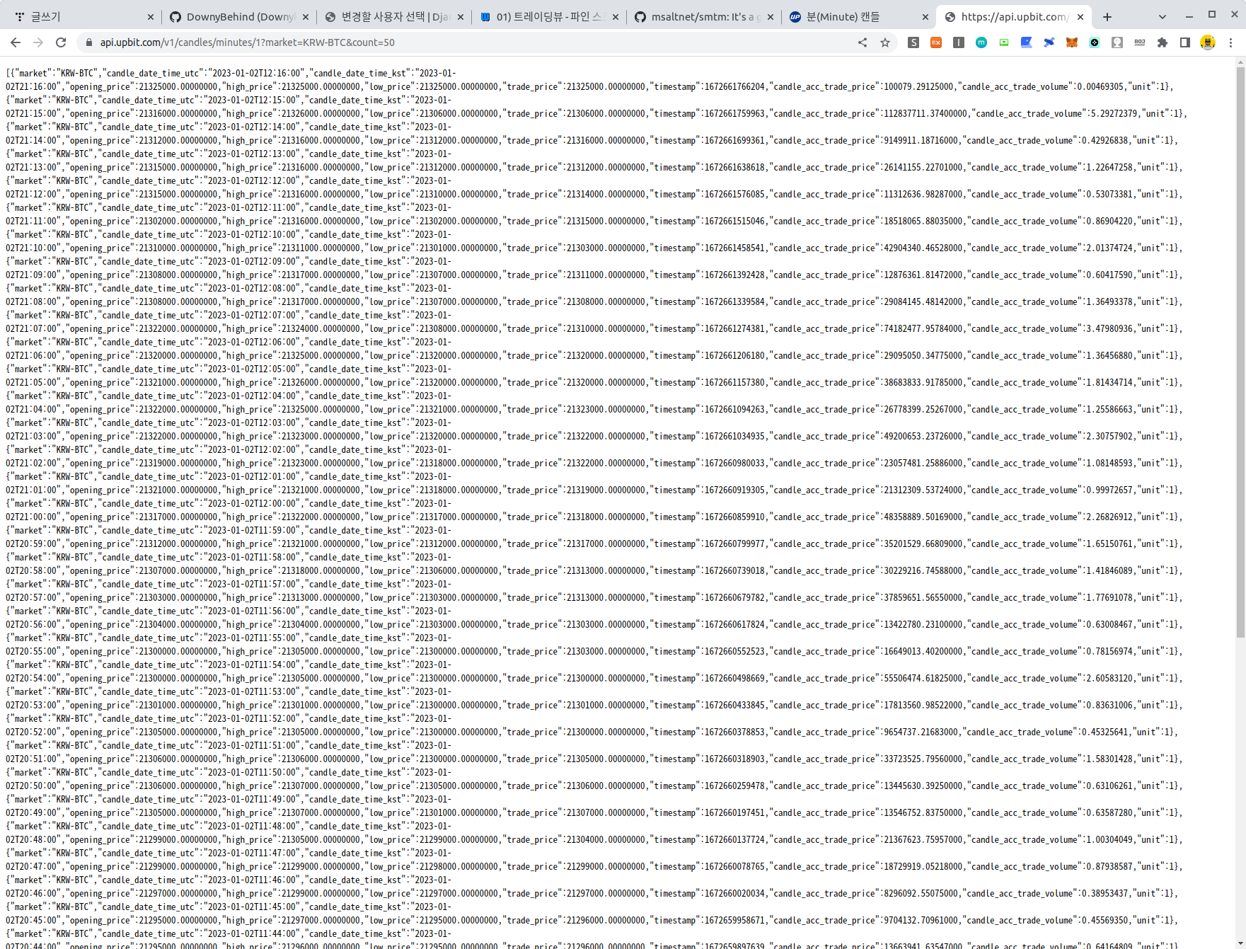 해당 결과는 호출 시점에서 가장 최근 50개의 비트코인 원화 마켓의 1분봉 데이터이다.