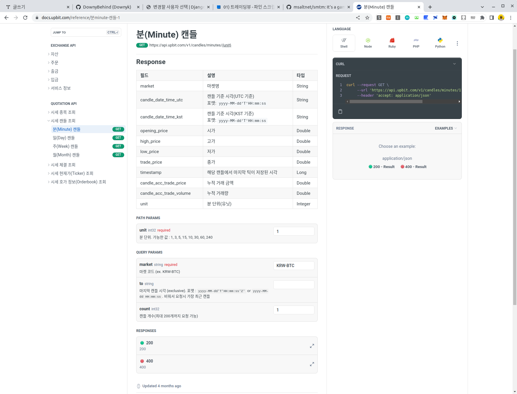 업비트 개발자 사이트에 접속하면 과거 거래 데이터를 가져올 수 있는 REST API 예시를 친절하게 제공하고 있다.