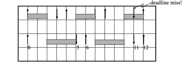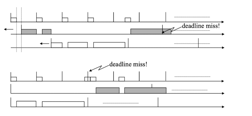 그림에서 첫번째 패턴은 도착 패턴(Release Pattern)이 동기화되지 않은 상황에서 Deadline Miss가 발생한 모습이다.