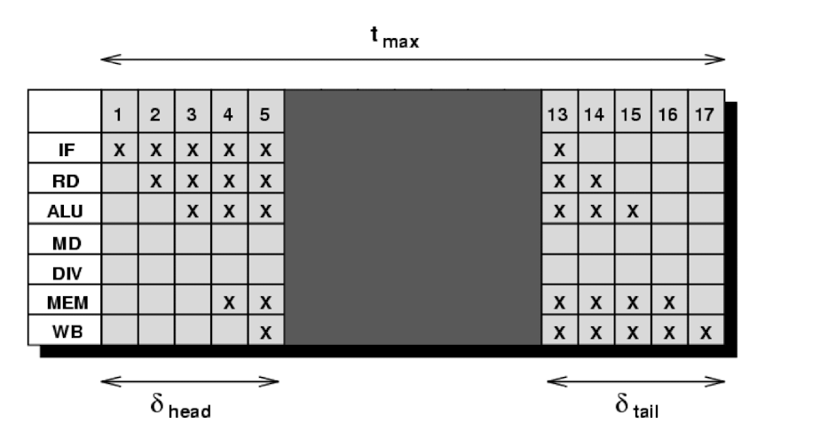 우리가 분석하려는 프로그램은 Construct의 조합 ($S_1,S_2...$)인데, 단순히 시간 $T(S_1), T(S_2)$를 더하지 않고, 각 Construct의 Reservation Table $W(S)$를 Concatenate하는 방식 사용