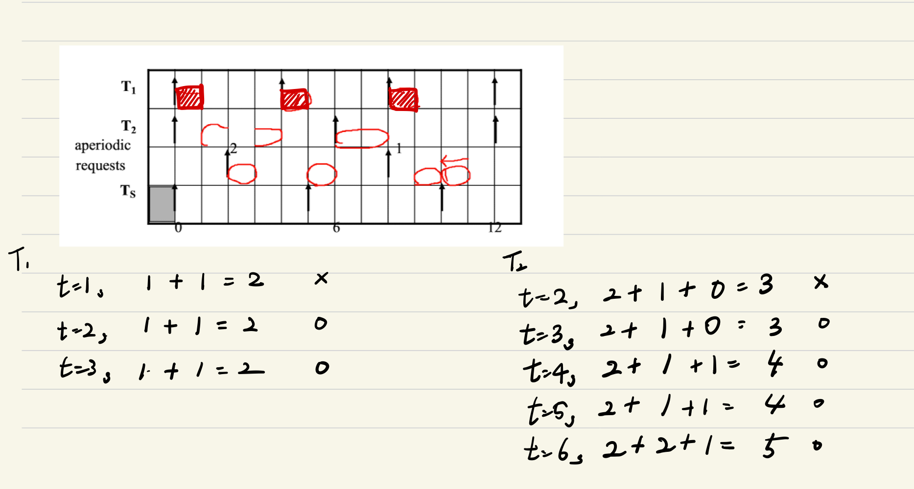 위 그래프에서 $T_1$은 주기 4에 실행시간 1을 점유하고, $T_2$는 주기 7에 실행 시간 2를 점유한다.