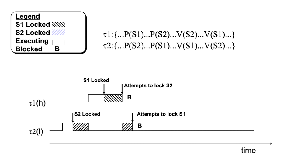 만약에 두 Task가 두 개의 자원을 공유한다고 할 때, PIP 환경 하에서는 위와 같이 Deadlock(교착상태)에 빠질 수 있다.