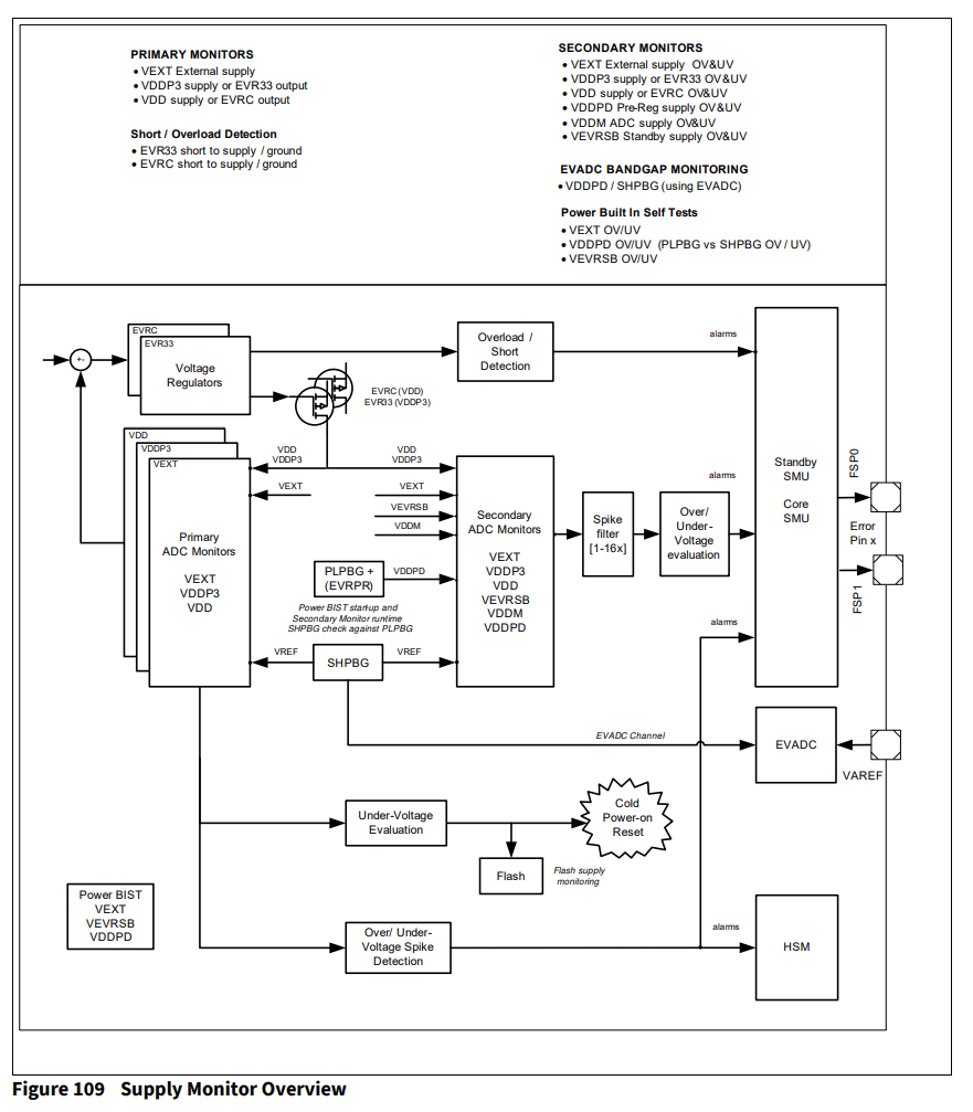 맨 위의 그림에서 보다시피, Primary Monitor에서 VEXT, VDDP3, VDD를 모니터링하는데 해당 전압에 UV가 생기면 즉시 Reset을 발생시킨다. OV가 생길 시에는 HSM과 SMU에 해당 고장을 전파하게 된다.