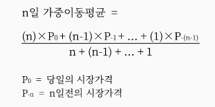 WMA는 단순히 이동평균을 구하는 것이 아니라 최근의 주가에 가중치를 두어서 계산하는 방식을 취한다.
